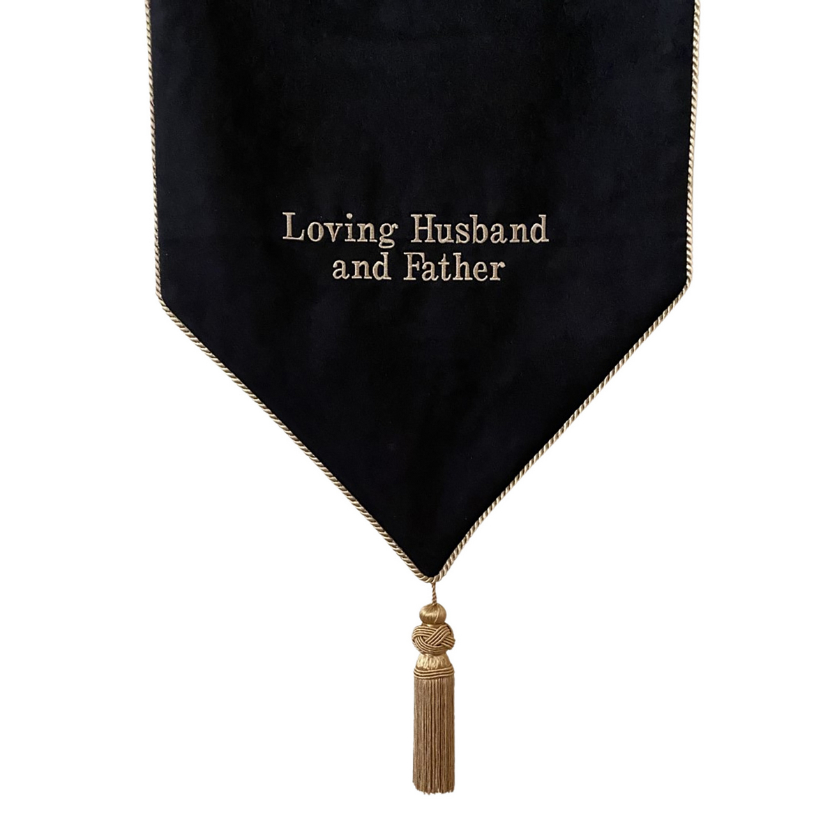 Black embroidered drape with Loving Husband & Father message and gold trim.
