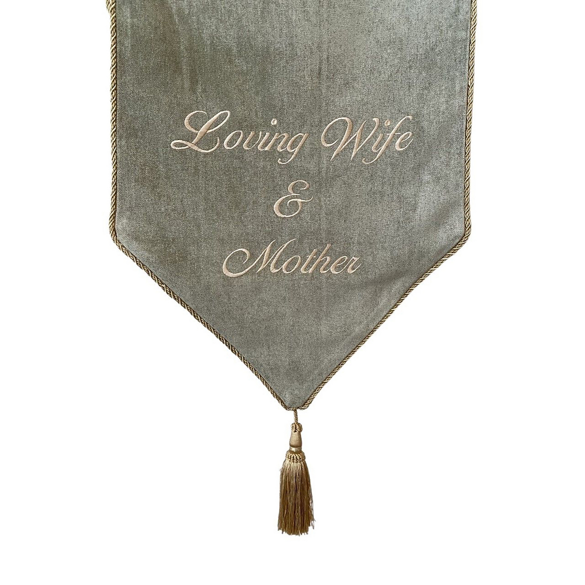 This soft green embroidered casket drape displays gold embroidery reading “Loving Wife & Mother.” Coordinated gold trim and a gold tassel complete the design. Intended for placement over the closed portion of the casket during indoor memorial services.
