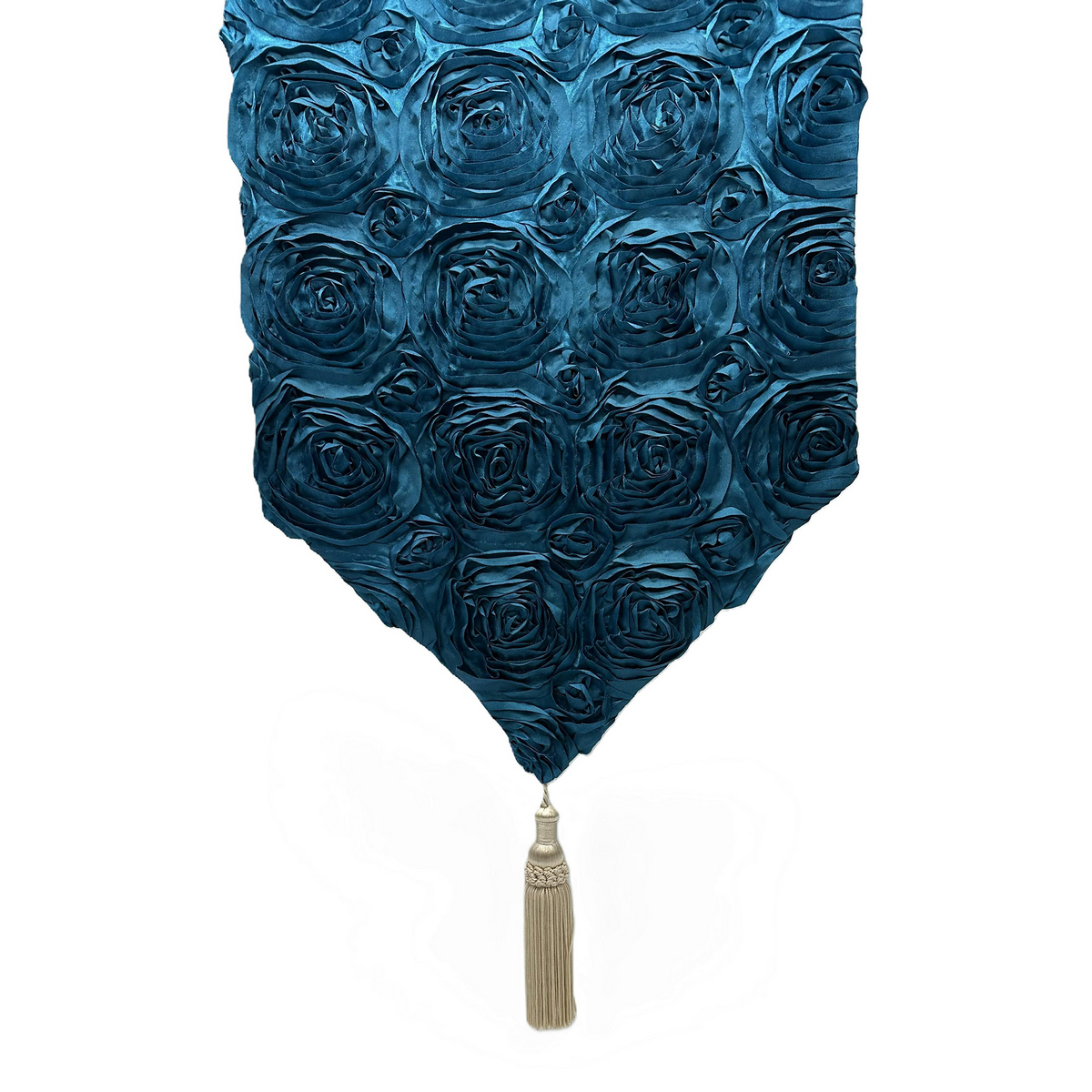 This turquoise decorative casket drape features a rosette-textured pattern and coordinated ivory trim. An ivory tassel provides a completed finish. Designed for placement over the closed portion of the casket during indoor memorial services.